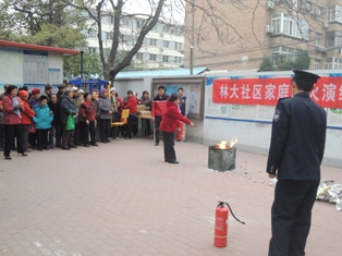 为使居民能够更加直观的学习使用灭火器消除初期火灾的方法,保安人员在社区文体广场上模拟了两次小型火灾现场,一名社区居民在保卫处保安人员的带领下进行了灭火演练,以简单易学的“四步法”教会大家正确使用灭火器灭火。