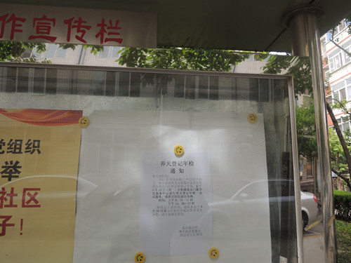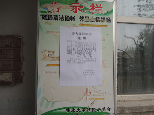 为配合派出所做好2015年度养犬集中登记年检一站式服务工作,方便社区养犬居民在家门口一次完成犬只登记年检和免费注射狂犬病疫苗,林大社区居委会加大依法、文明养犬的宣传力度。1.在社区橱窗及27栋居民楼的各个单元门“公示栏”内张贴了98份《养犬登记年检通知》,通知社区养犬居民于5月25日到柏儒苑东门新居民服务中心为自家的犬只办理登记年检手续。逾期未办理的,务必在6月30日前自行到东升派出所养犬办公室办理;2.居委会工作人员逐一给30余名社区养犬居民打电话,通知大家5月25日到柏儒苑新居民服务中心办理犬只年检手续;3.发动社区养犬自律会成员、楼门组长、社区安全稳定信息员和林和、育新物业等多方力量,积极引导社区养犬居民主动为自家犬只办理登记年检手续,最大限度地将社区犬只纳入依法管理范围,倡导爱护环境卫生,依法、文明、科学养犬的理念。